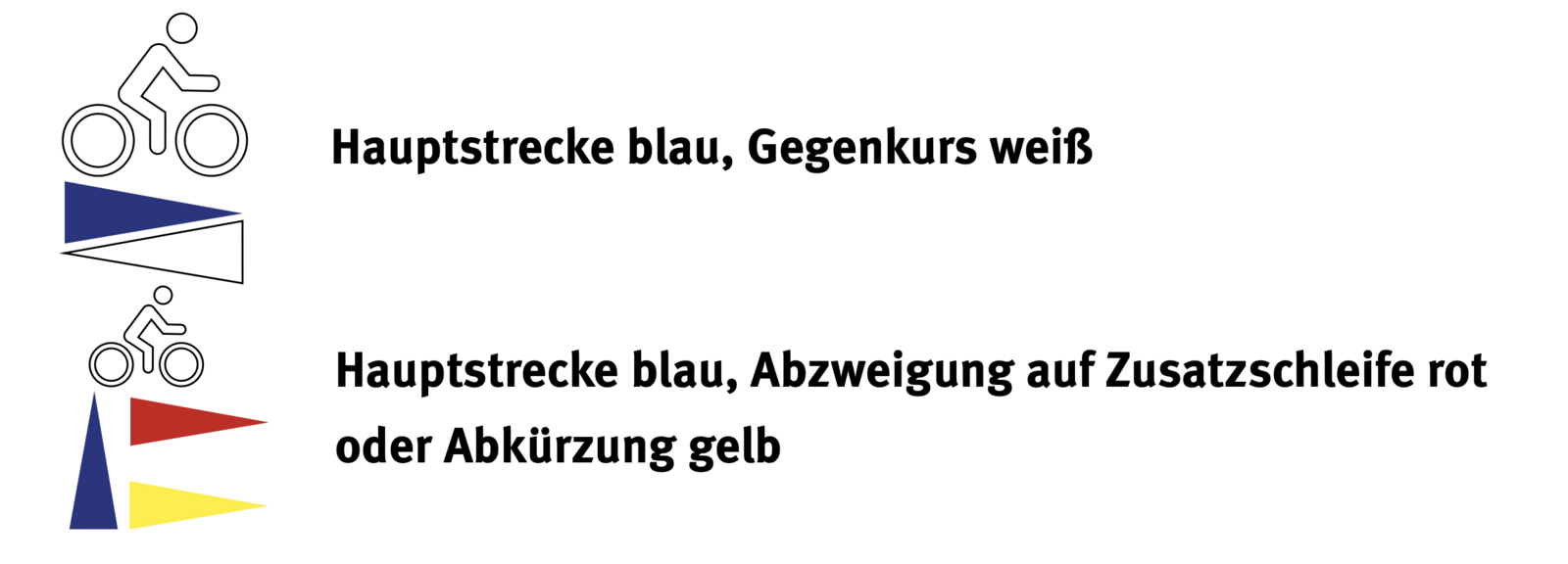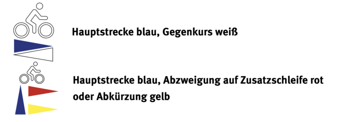 Die Markierung der Rundkurse besteht aus einer Kombination aus auf Bäumen aufgemalten Symbolen oder/und kleinen Schildern mit der Hütti-MTB-Haselmaus und Pfeilen, die an Holzpfählen befestigt sind. Die Pfeile der Symbole und auf den Schildern haben folgende Farben: