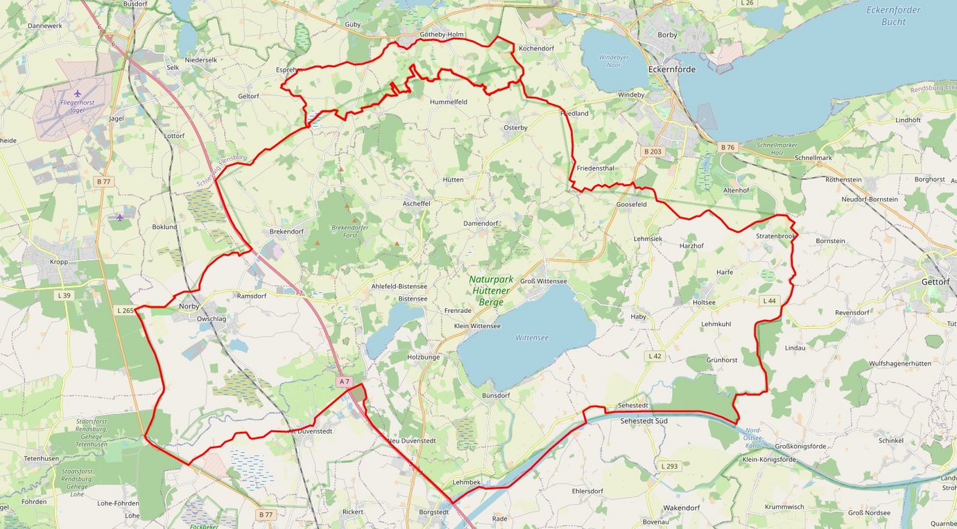 Die nächsten größeren Orte sind Schleswig im Norden, Eckernförde im Nordosten und Rendsburg im Südwesten, die Entfernung zur Landeshauptstadt Kiel beträgt rund 20 km. Nachbarnaturparke sind im Norden der Naturpark Schlei und im Süden der Naturpark Westensee.