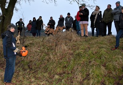 Anschließend wurden im Kolonistenhof tiefergehende Erkenntnisse zur Pflege der Knicks im Rahmen einer Filmpräsentation und zwei Fachvorträgen vermittelt. Bei Kuchen und Punsch mit Früchten aus dem Knick bestand abschließend die Möglichkeit zu einem geselligen Austausch. Der Naturparkvorsitzende Detlef Kroll freute sich über die große Resonanz: „Es ist sehr schön, zu sehen, wie viele Menschen sich für die regionalen Knicks interessieren, die seit Jahrhunderten die Landschaft unseres Naturparkes prägen“.