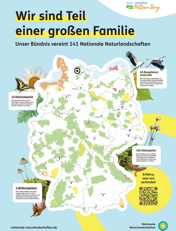 Der Naturpark Hüttener Berge ist Teil der Nationalen Naturlandschaften (NNL). Dieses Bündnis vereint die deutschen Nationalparke, Naturparke, Biosphärenreservate und Wildnisgebiete. Diese sind verbunden durch eine gemeinsame Vision: "Gemeinsam bewahren wir die Natur mit Freude und leben nachhaltig sowie klimaneutral."