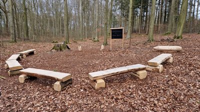 Naturbelassene Bänke aus regionalem Eichenholz bieten Platz für ganze Schulklassen und laden zum gemeinsamen Lernen und Verweilen ein. Eine wetterfeste Kreidetafel ermöglicht es, den Unterricht direkt vor Ort anschaulich zu gestalten. Besonders beeindruckend sind die überdimensionalen 3D-Schnitzereien von Waldfrüchten, wie Eicheln und Fichtenzapfen. Diese interaktiven Elemente machen den Lernort lebendig und regen dazu an, die Besonderheiten der jeweiligen Früchte zu entdecken. Ergänzend bieten kleine Informationsschilder an den Schnitzereien spannende Fakten zu den Früchten, die in der Umgebung des Grünen Klassenzimmers wachsen. So wird der direkte Bezug zum Wald und seinen Ressourcen erlebbar gemacht.