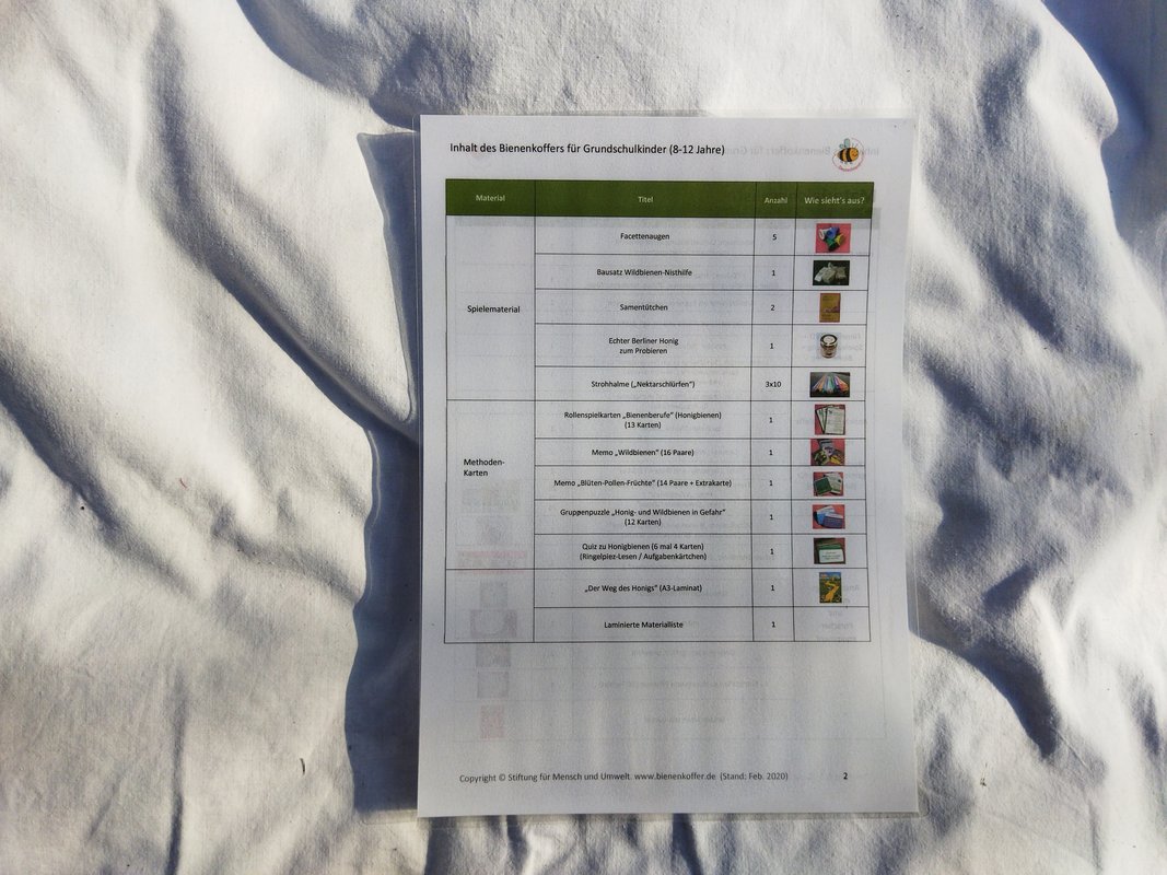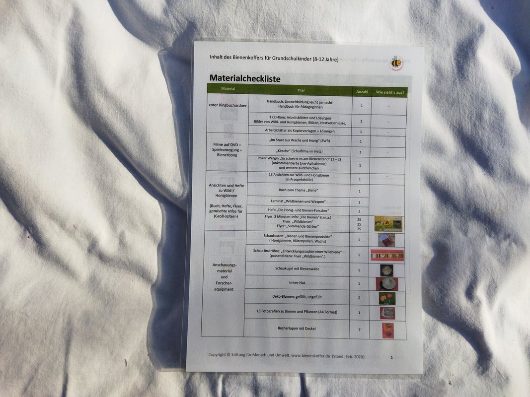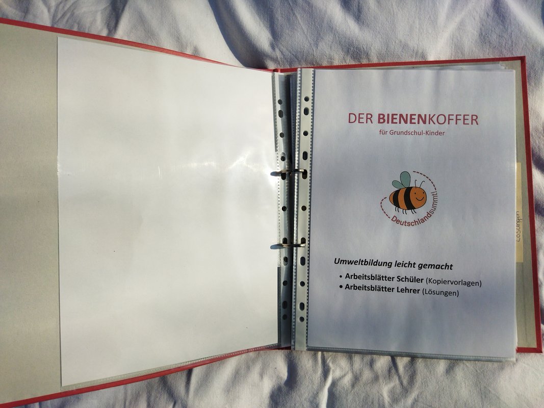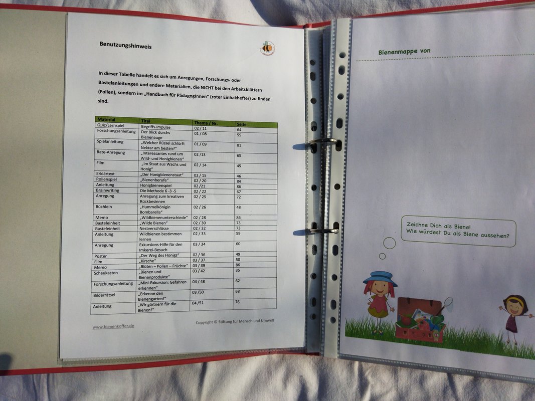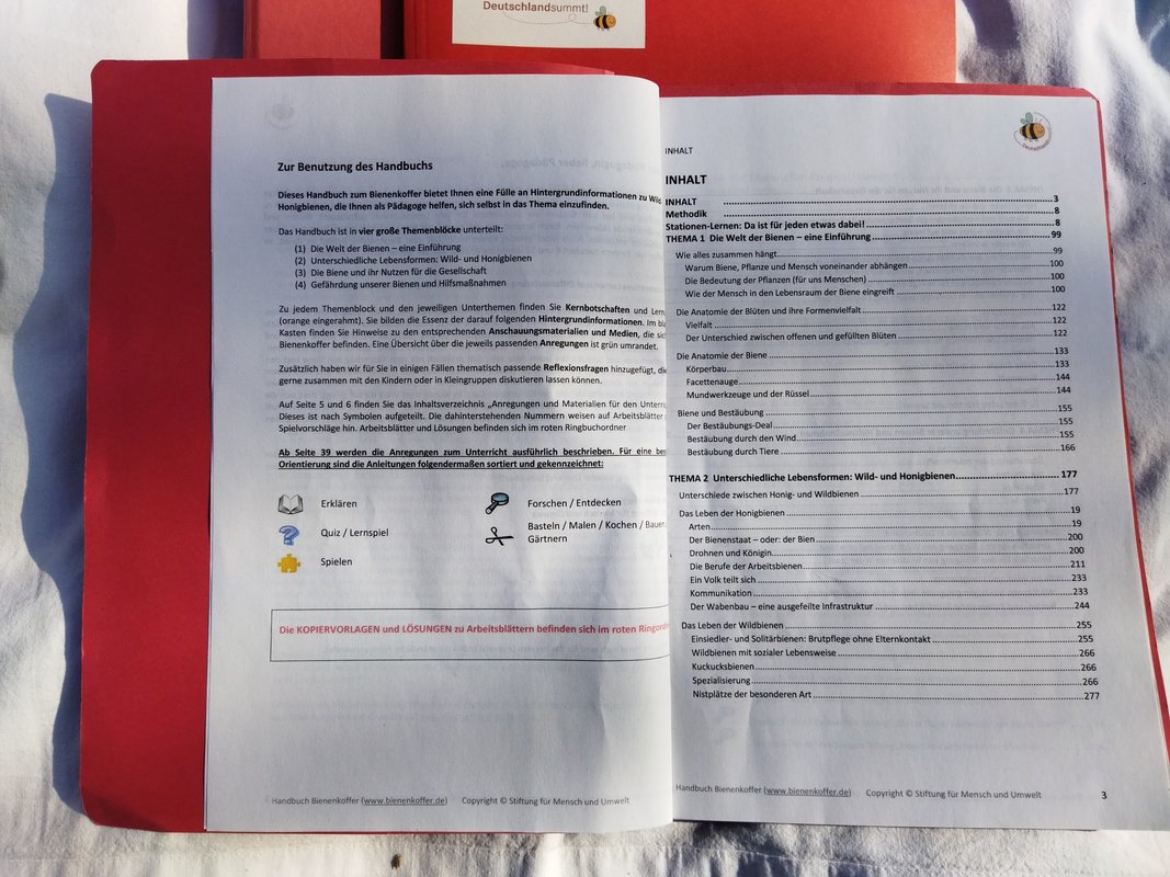 Das Herzstück des Koffers ist das Handbuch, das kompakt und unterhaltsam die wichtigsten Informationen über Bienen und ihre Lebensweise vermittelt. Es dient den Lehrkräften als Leitfaden, um sich in ca. einer Stunde in die Thematik einzuarbeiten und bietet zahlreiche Praxisideen für den Unterricht.