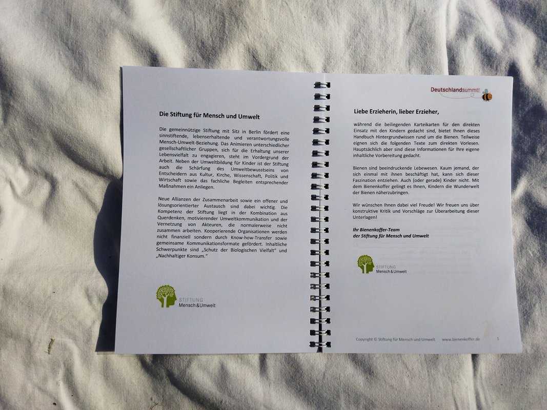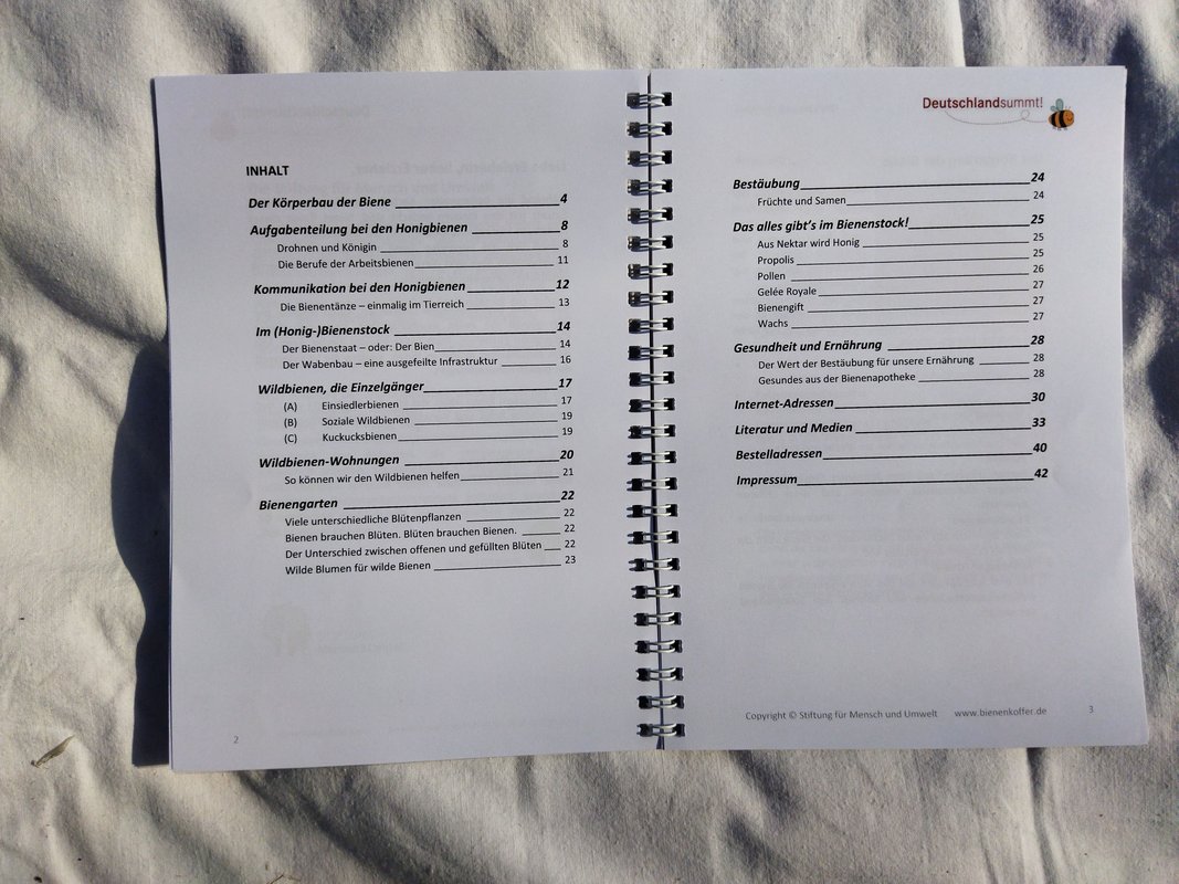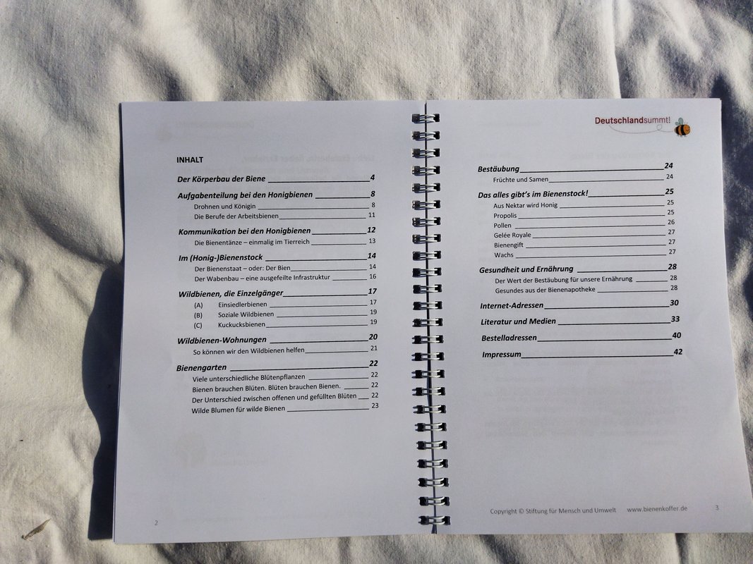 Das Herzstück des Koffers ist sein Handbuch. Im handlichen DIN A5-Format und auf knapp 30 Seiten liefert es eine ansprechende und kompakte Zusammenfassung der wichtigsten Informationen über Bienen und ihr Leben im Bienenstock sowie in der Natur. Reichlich mit Bildern und Grafiken illustriert, macht das Handbuch das Eintauchen in die Thematik leicht und unterhaltsam.