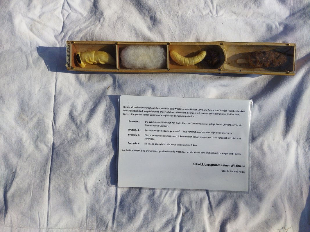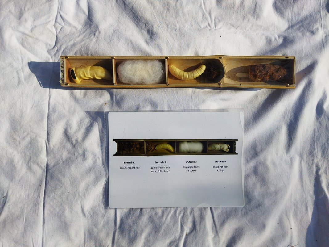 Ein besonderes Highlight ist das Brutröhrenmodell, das anschaulich zeigt, wie sich aus einem Ei nach und nach das erwachsene Insekt entwickelt. Diese praktischen Materialien bieten den Kindern die Möglichkeit, die komplexen Prozesse im Leben der Bienen auf spielerische Weise zu verstehen und zu erleben.
