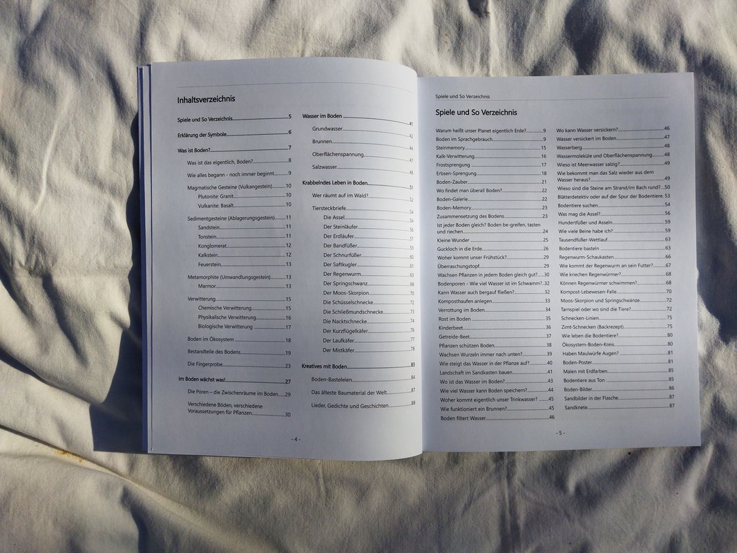 Zusätzlich enthält der Koffer einen Boden-Kalender, der monatlich verschiedene Bodenarten und ihre Besonderheiten vorstellt. Er bietet Experimente und Umsetzungsideen, die in den Alltag integriert werden können.